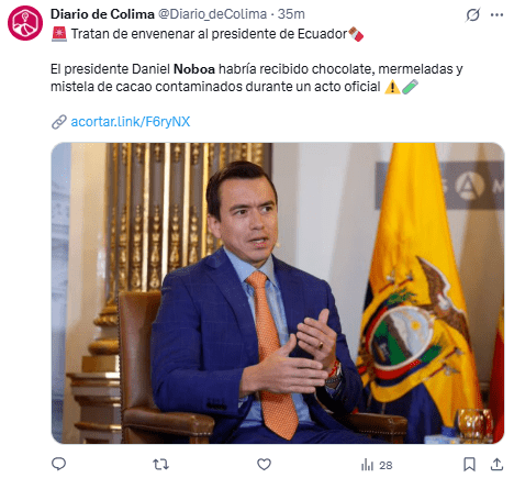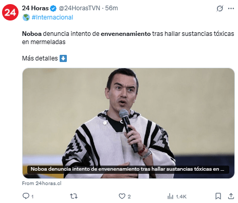 Regeneración, 24 de octubre de 2025– Daniel Noboa, aseguró que fue víctima de un intento de envenenarlo tras recibir obsequios que contenían sustancias químicas tóxicas, durante un encuentro con agricultores en la provincia costera de Los Ríos.