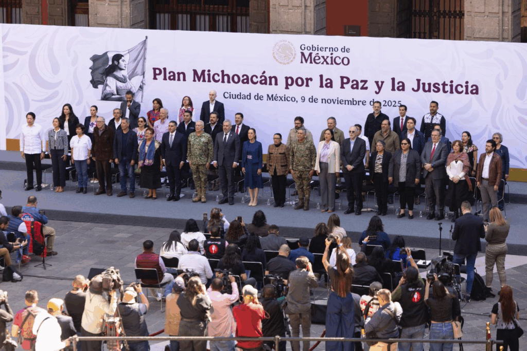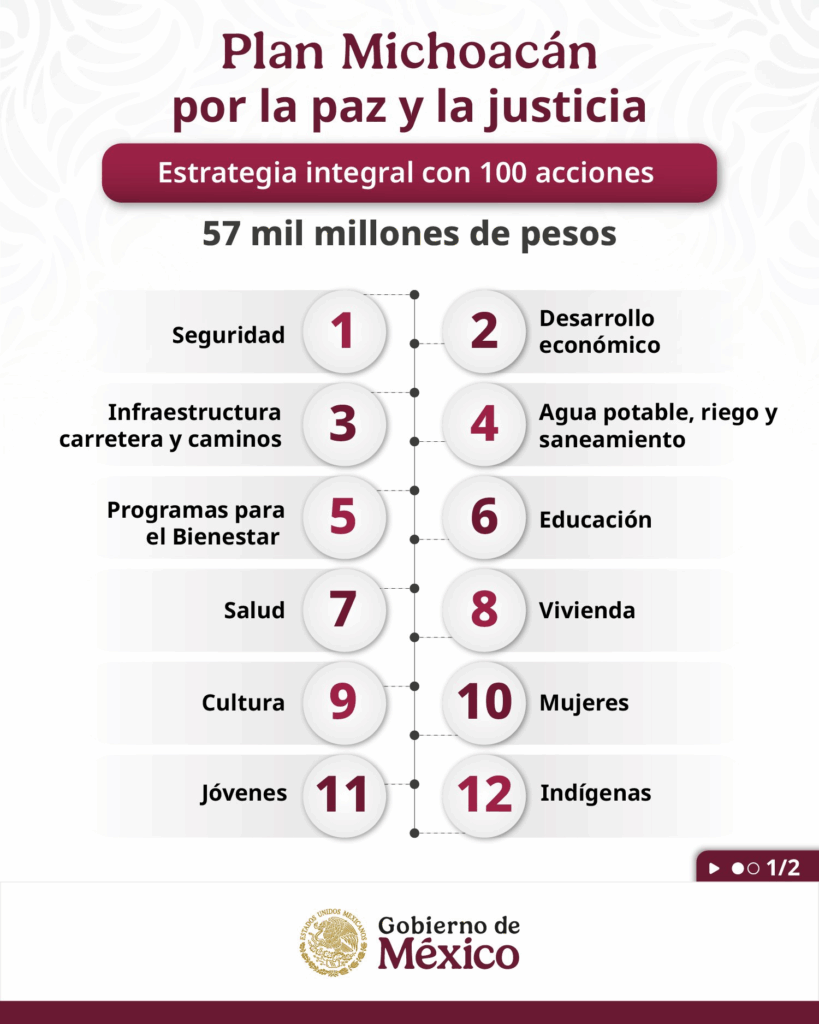 Regeneración, 10 de noviembre de 2025. La Presidenta de México, Claudia Sheinbaum Pardo presentó los 12 ejes del Plan Michoacán por la Paz y la Justicia, una estrategia integral con más de 100 acciones y una inversión de más de 57 mil millones de pesos (mdp).