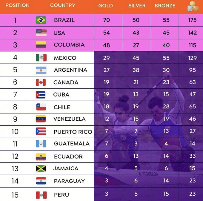 México quedó en el cuarto lugar de la clasificación con 129 preseas, por debajo de las 172 que se ganaron en la primera edición del certamen en Cali-Valle 2021.
