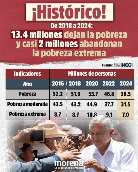 Precisó además que en 2018, de 51.9 millones de personas, en 2024 a 38.5 millones; más de 13 millones de personas salieron de la pobreza.