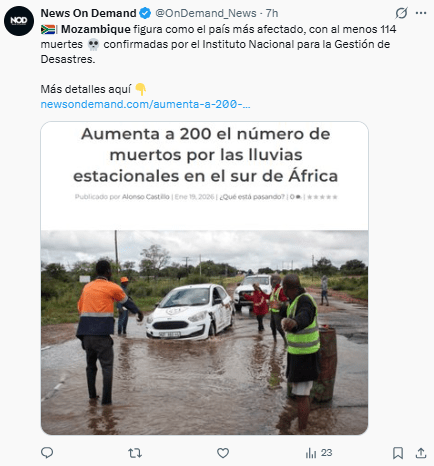 Regeneración, 20 de enero 2026– Las fuertes lluvias y tormentas que han golpeado el sur de África desde octubre han causado una seria crisis humanitaria, dejando 150 muertes y miles de desplazados, y afectando principalmente a Mozambique y Sudáfrica.