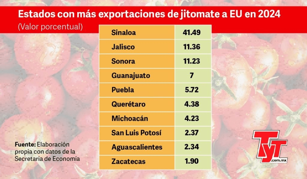 Y es que Economía y Agricultura explicaron como lo han hecho anteriormente que 2 de cada 3 jitomates que se consumen en EE.UU son mexicanos.