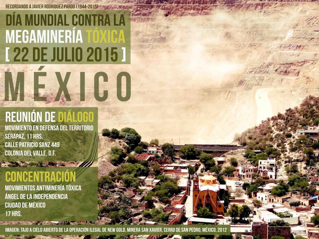 Regeneración, 21 de julio de 2015. México, D.F. Con la dramática imagen del enorme hueco del tajo a cielo abierto que la Minera San Xavier, filial en México de la empresa canadiense New Gold, dejó en lo que fue el Cerro de San Pedro en San Luis Potosí, se hizo la convocatoria a participar en el Día Mundial contra la Megaminería Tóxica en nuestro país, este miércoles 22 de julio.
