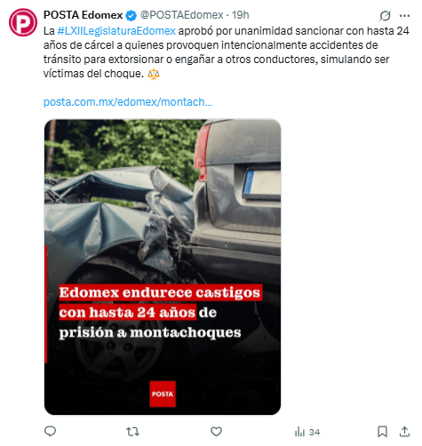 Regeneración, 31 de octubre 2025– Por unanimidad, el Congreso del Estado de México aprobó una reforma al Código Penal para que se castigue con hasta 24 años de prisión a quienes, de forma intencional, provoquen incidentes de tránsito para obtener un beneficio económico indebido.