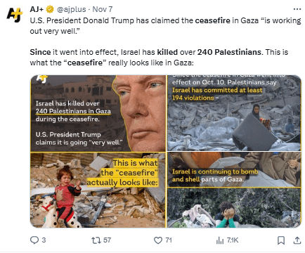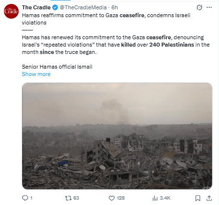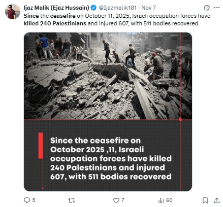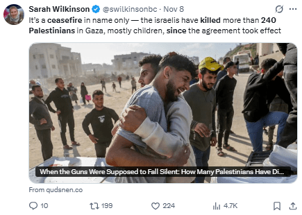 Regeneración, 10 de noviembre 2025– En el mes hoy cumplido desde que se declaró el alto al fuego, las fuerzas israelíes han matado a más de 240 palestinos, muchos de los cuales, según informes, intentaban regresar a sus hogares o moverse por áreas previamente evacuadas.