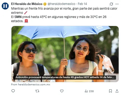 Regeneración, 16 de febrero 2026– El Servicio Meteorológico Nacional (SMN) señaló que un anticiclón en la parte media de la atmósfera en el oeste del país provocará un incremento notable del calor en muchas áreas, especialmente en el centro y sur de México.