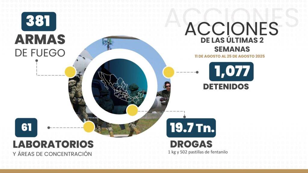 Se trata de informe de Harfuch quien señaló que del 1 de octubre de 2024 al 25 de agosto de 2025, además se han asegurado más de 240 toneladas de droga.
