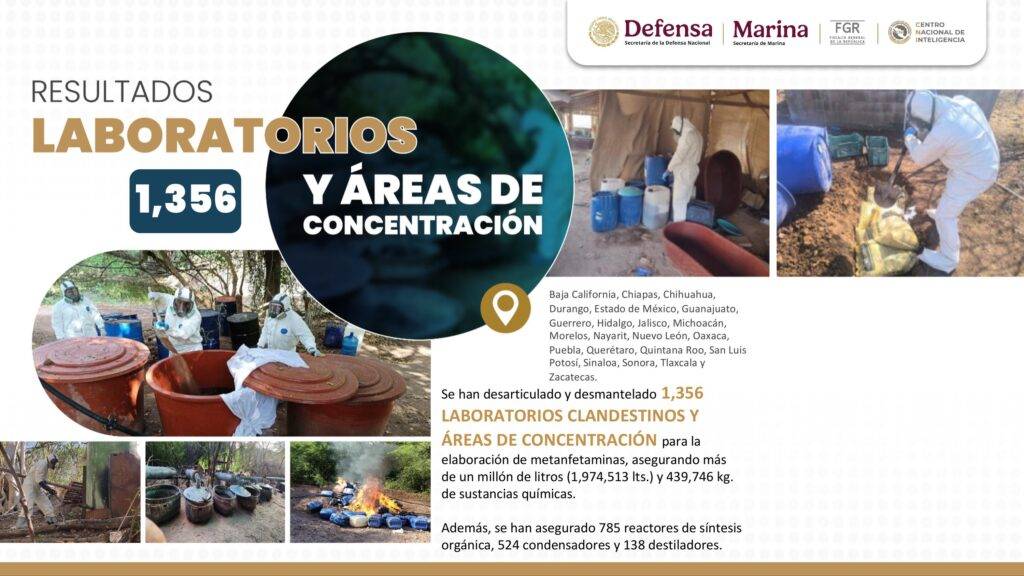 Aunado a lo anterior, García Harfuch detalló que se han desmantelado mil 356 laboratorios donde se producían drogas.