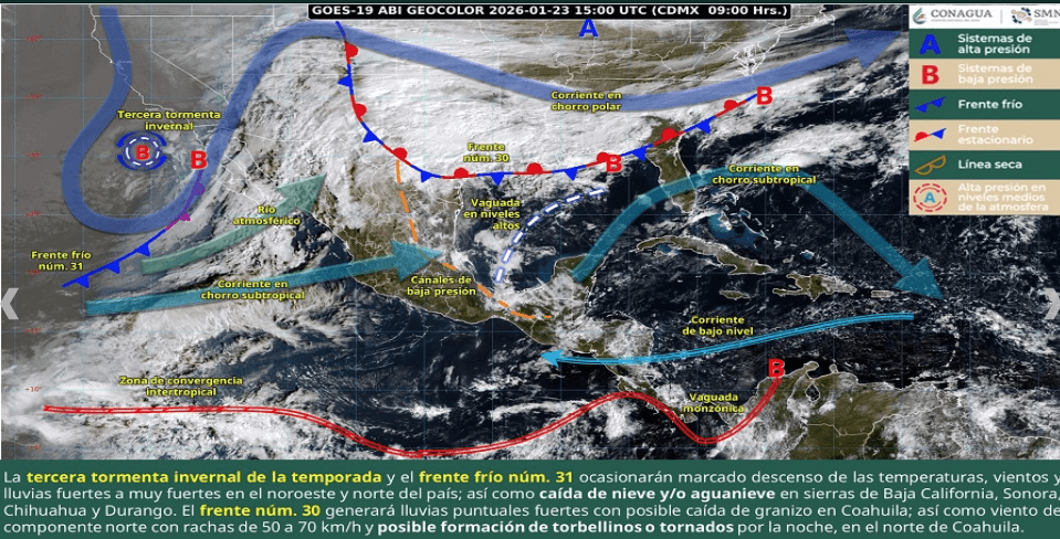 Regeneración, 23 de enero de 2026.– Una circulación ciclónica en altura dará origen a la tercera tormenta invernal de la temporada actual. Este fenómeno interaccionará con el frente frío número 31 y un río atmosférico sobre el noroeste.