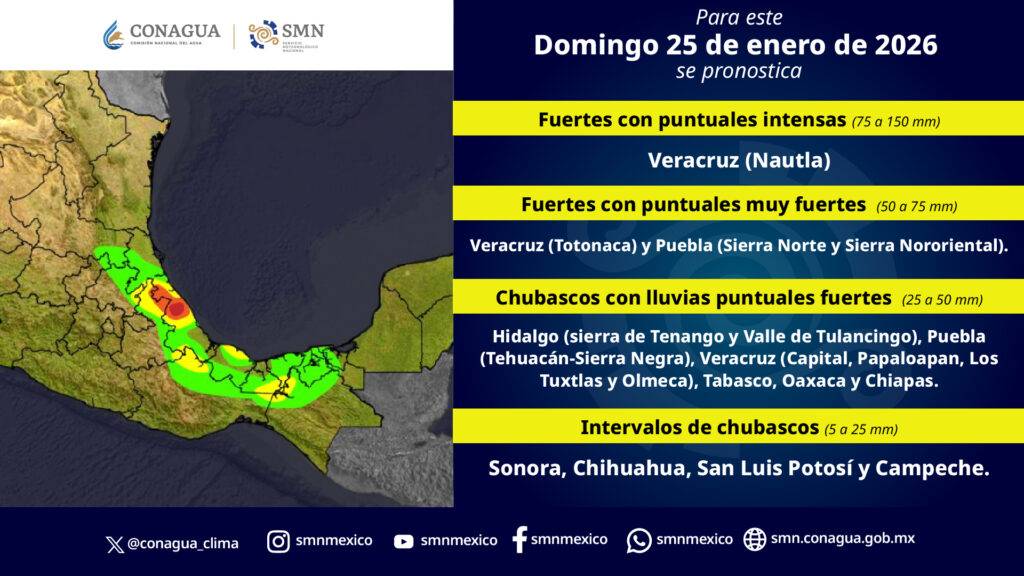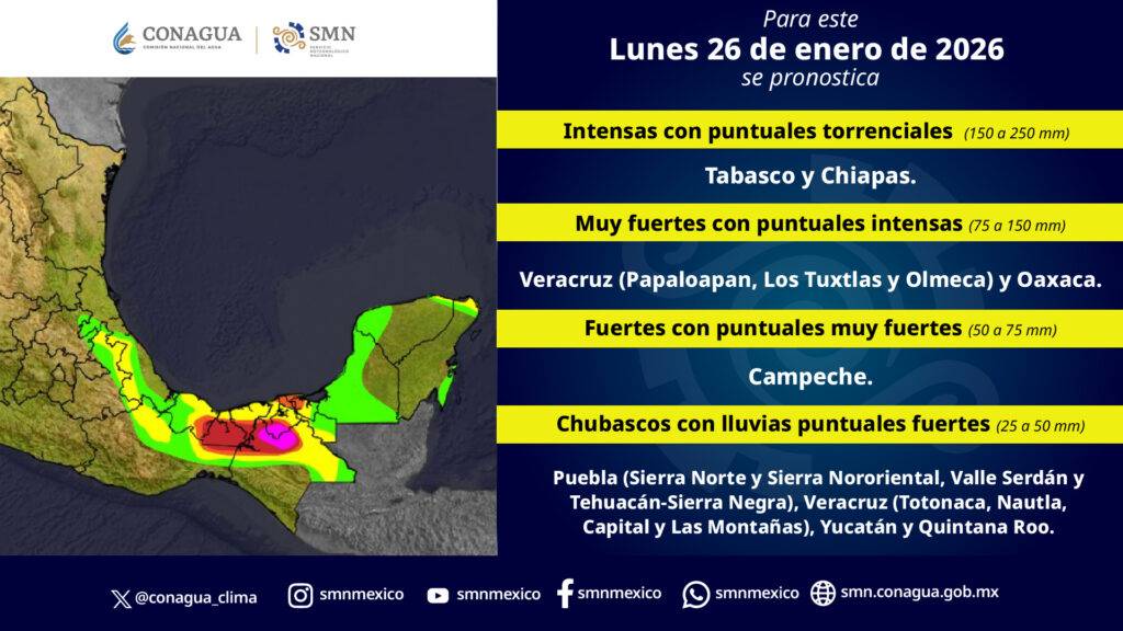Para el domingo y lunes se prevén lluvias intensas en el sureste mexicano. El centro y oriente del país registrarán un marcado descenso en las temperaturas.