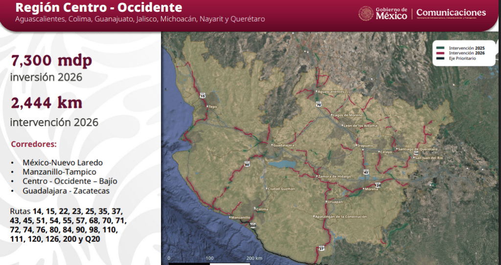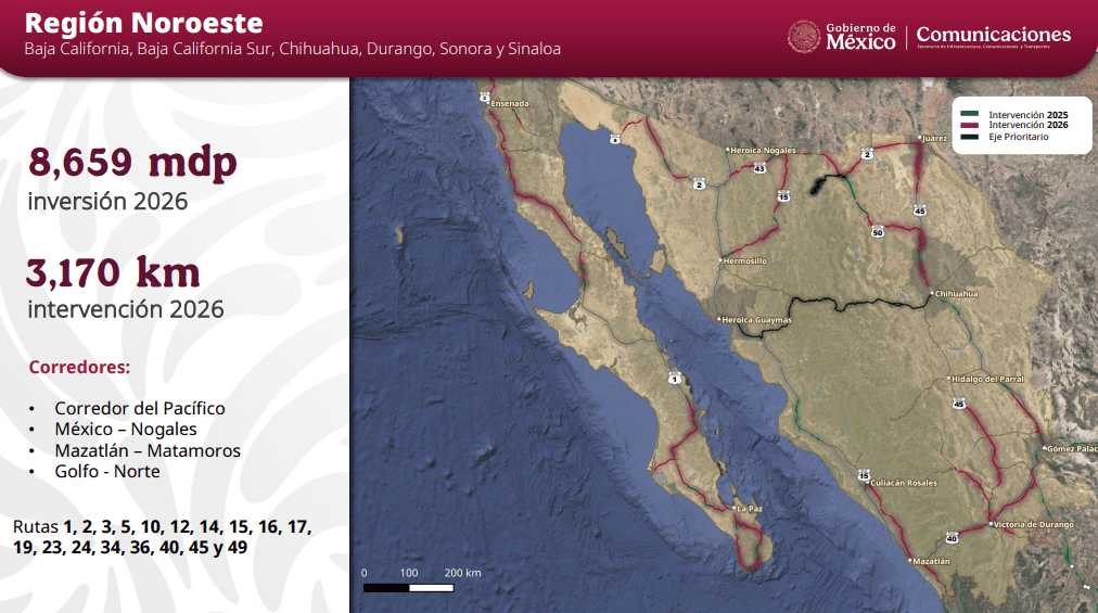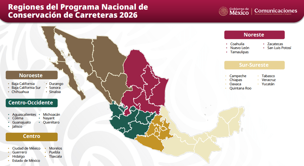 El Programa Nacional de Carreteras 2026 cubre las regiones Noroeste, Centro-Occidente-Centro, Noreste y Sur-Sureste.