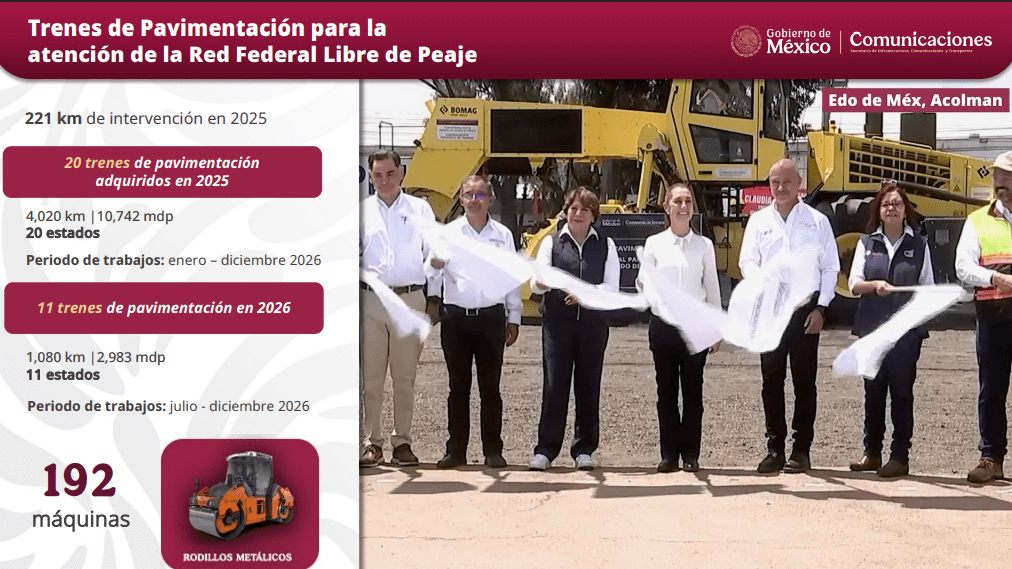 Durante 2026 cubrirán cinco mil 100 kilómetros en 31 entidades con apoyo de once trenes de pavimentación adicionales e inversión federal de 13 mil 725 millones de pesos.