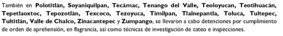 Así como técnicas de investigación de cateo e inspecciones se desarrollaron de manera simultánea en 46 municipios del Edomex que presentan la mayor incidencia en torno a este delito.