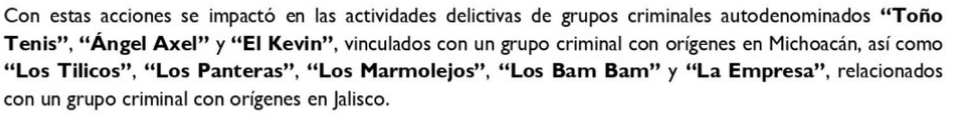 Seguidamente, se precisa que entre el 9 y 12 de diciembre pasados, se desplegaron acciones simultáneas con la participación de Guardia Nacional, Defensa y la Marina.