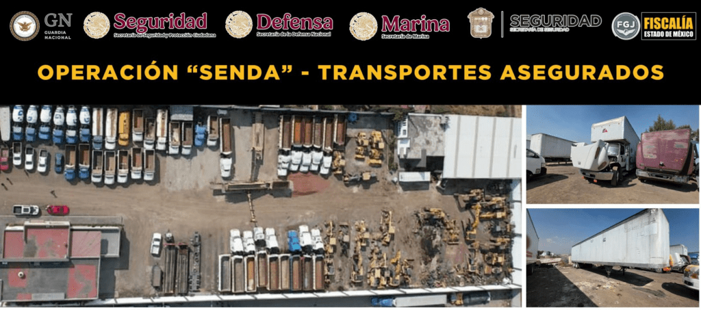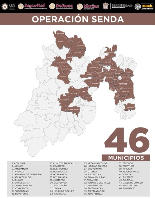 «Para combatir el delito de robo a transporte de carga en carreteras y vialidades del Edomex, fuerzas federales y estatales desplegaron la Operación “Senda” en 46 municipios de la entidad».