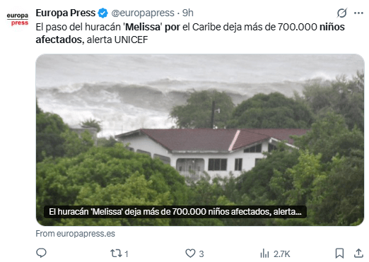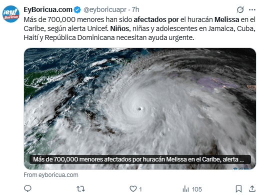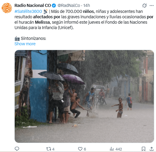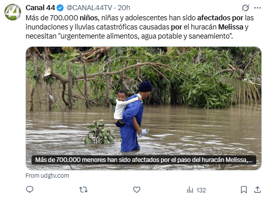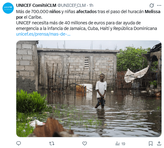 Regeneración, 31 de octubre 2025– Varios días de lluvias torrenciales, marejadas ciclónicas e inundaciones catastróficas causadas por el huracán Melissa han afectado la vida de más de 700.000 niños en todo el Caribe, según estimaciones de UNICEF.