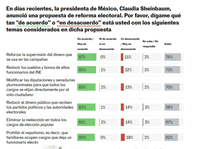 Lo que resalta es una alta aprobación ciudadana a la propuesta: «La propuesta de reforma electoral de Claudia Sheinbaum pasa con creces la prueba de popularidad».