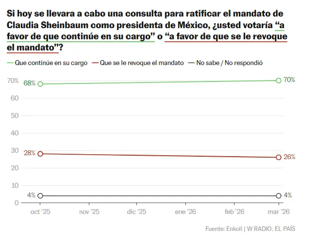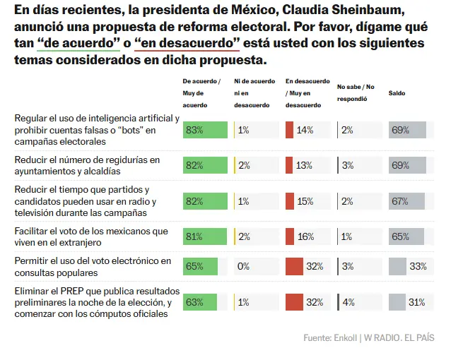Regeneración 6 de marzo de 2026. EL PAIS y W Radio encargaron a la casa Enkoll una encuesta sobre la reforma electoral de Sheinbaum, en datos antes de conocerse el texto formal, pero luego de darse a conocer su contendio puntual.