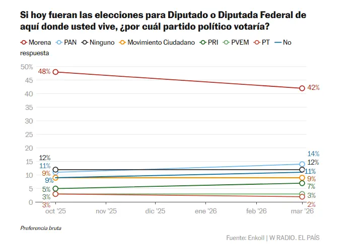 Esto es, el PAN pasó del 12% al 14% entre octubre de 2025 y marzo de 2026; MC se mantuvo en el 9% y el PRI pasó del 5 al 7% de intención de voto.
