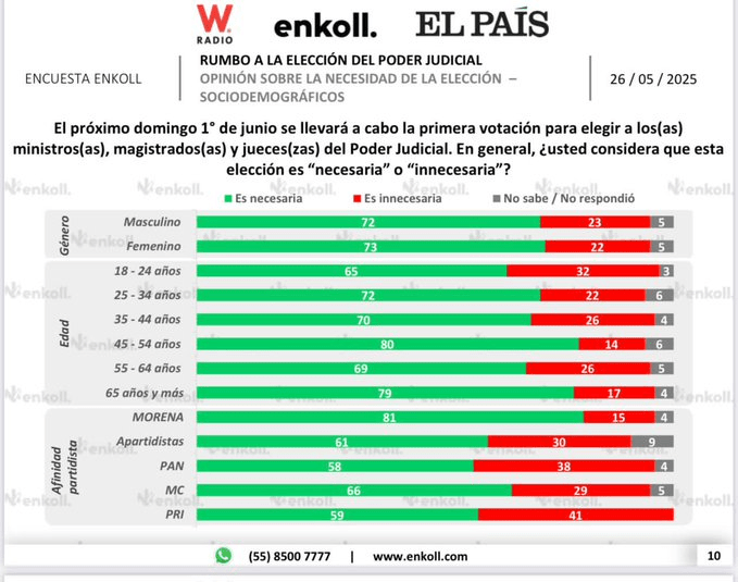 Regeneración, 26 de mayo de 2025.Durante la conferencia de la mañana del 26 de mayo, la presidenta Claudia Sheinbaum mostró los resultados de una encuesta de la empresa Enkoll, que fue publicada por El País.
