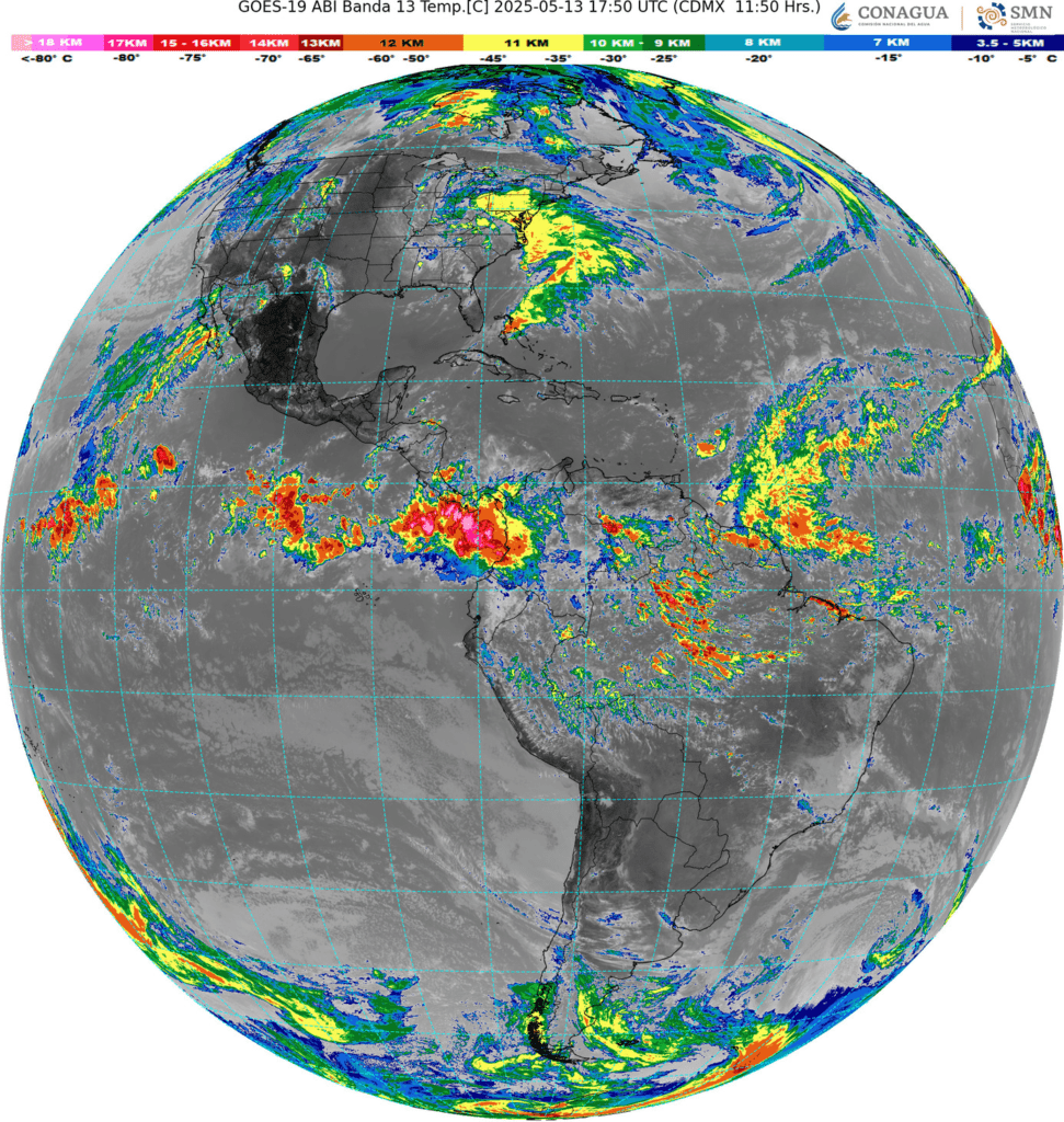 Regeneración, 13 de mayo de 2025. El Servicio Meteorológico Nacional indica humedad proveniente de los mares, frente frío 43 y dos ondas calor en México.