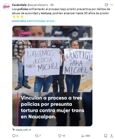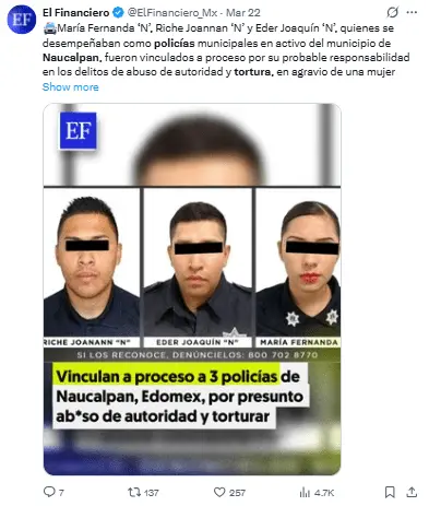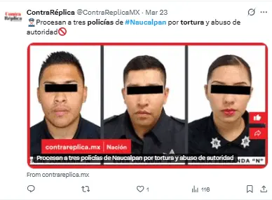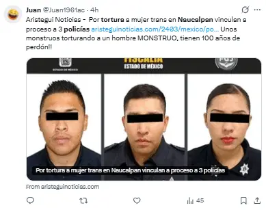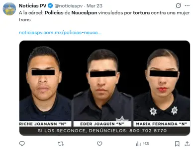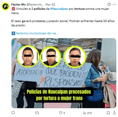 Regeneración, 25 de marzo 2026– La Fiscalía General de Justicia del Estado de México informó que tres policías municipales de Naucalpan de Juárez fueron llevados a proceso por su posible involucramiento en los delitos de abuso de autoridad y tortura en contra de una mujer trans.