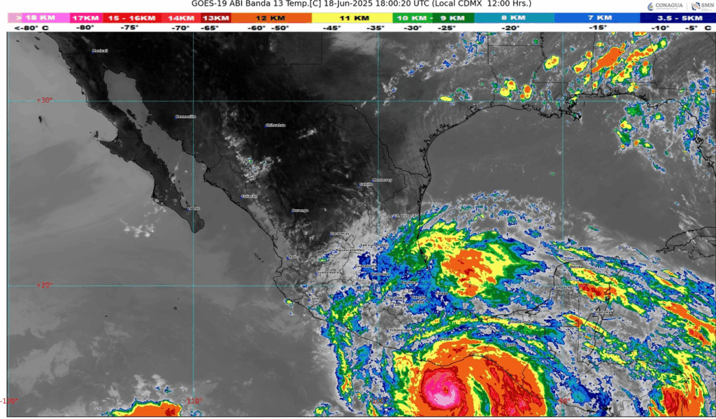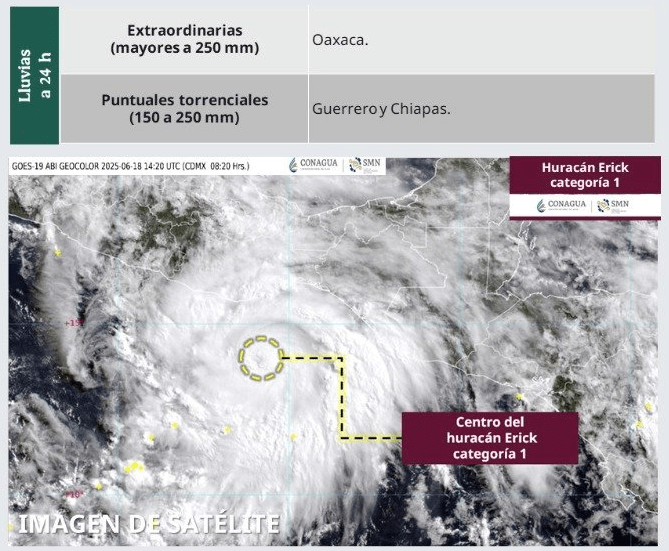 El huracán Erick y sus amplias bandas nubosas generan lluvias de extraordinarias, mayores a 250 milímetros, a torrenciales, de 150 a 250 milímetros, en tres estados del país.