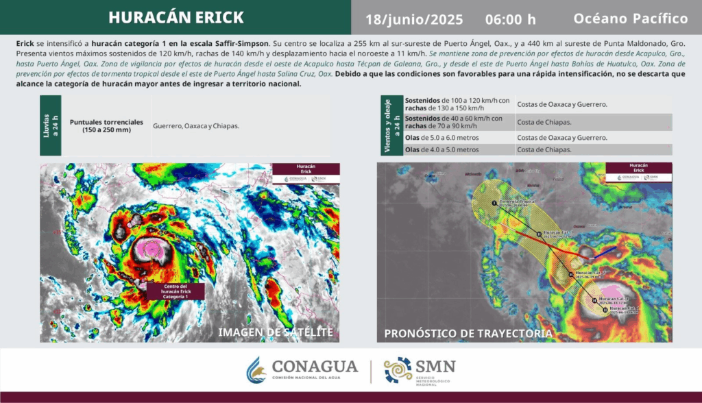 Así, conforme a información del SMN Erick ya es huracán categoría 1 que podría evolucionar a categoría 2.