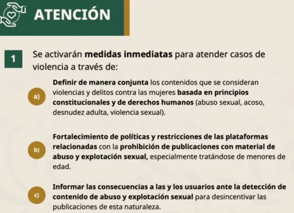Por su parte, Sheinbaum señaló que el acuerdo tiene como objetivo prevenir y atender la violencia digital en contra de mujeres y niñas a través de una colaboración voluntaria con las plataformas.