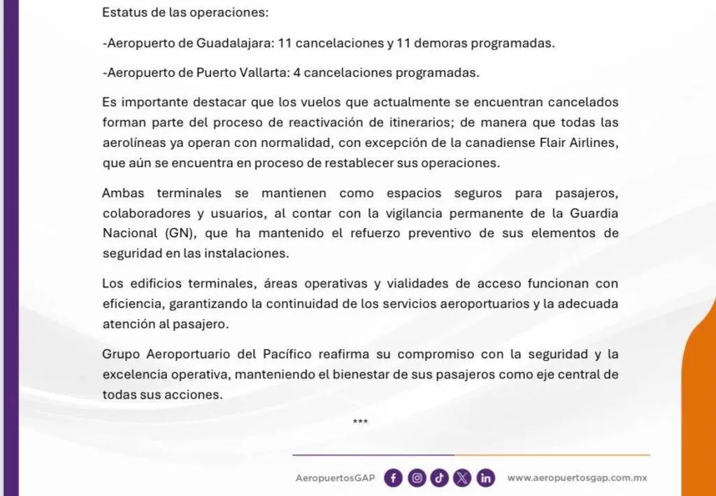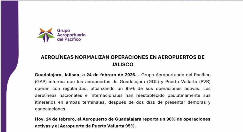 Regeneración, 24 de febrero de 2026.– El Grupo Aeroportuario del Pacífico reportó una mejoría significativa hoy. Los aeropuertos de Guadalajara y Puerto Vallarta operan con regularidad. Casi la totalidad de sus actividades comerciales se encuentran activas. El restablecimiento de los itinerarios ha sido un proceso paulatino y exitoso.