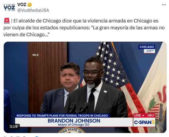 En lugar una ocupación militar, Johnson insta a Trump a detener el flujo de armas ilegales a Chicago desde estados gobernados por republicanos.