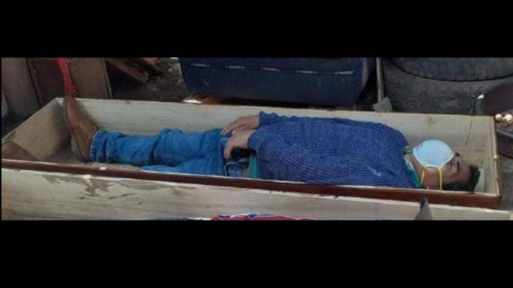 Regeneración, 21 de mayo del 2020. El alcalde de Tantará en la región de Huancavelica en Perú, Jaime Rolando Urbina Torres. Se introdujo en un ataúd, con los ojos cerrados y la mascarilla facial puesta, para evitar ser detenido por la policía.
