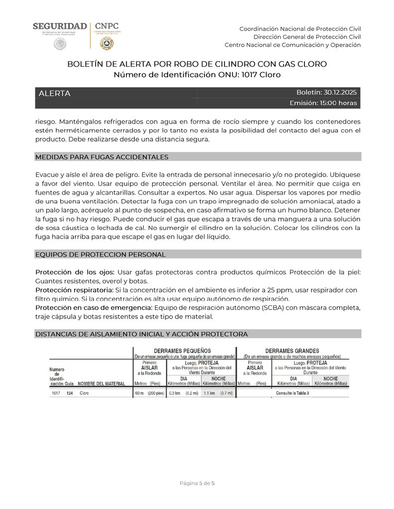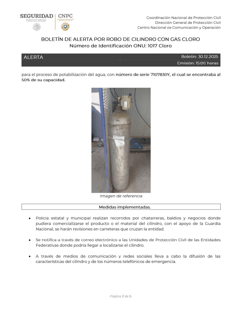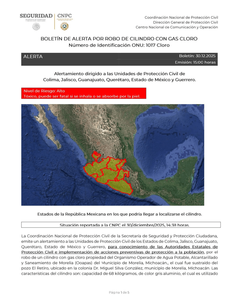 Regeneración, 31 de diciembre de 2025. Seguridad y Protección Ciudadana (SSPC), a través de Protección Civil, emitió una alerta por robo de cilindro de gas cloro del organismo operador de agua en Morelia.