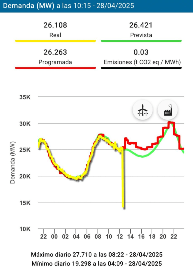 Al tiempo que la Red Eléctrica activó «planes de reposición del suministro eléctrico en colaboración con las empresas del sector tras el cero ocurrido en el sistema peninsular».