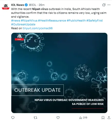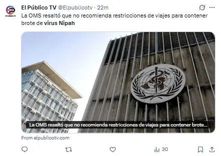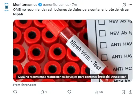 No hay indicios de un incremento en la transmisión humana que justifique la implementación de restricciones de viaje o comercio por Nipah