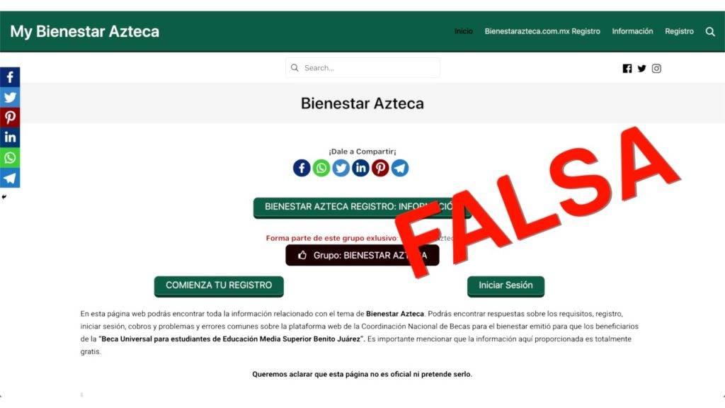 Asimismo, la plataforma falsa muestra el botón “Grupo Bienestar Azteca”, que remite a una página de Facebook con el mismo nombre, administrada por elderecho.online.org, página que ya ha sido desmentida y señalada de fraudulenta durante la emergencia sanitaria, por utilizar el nombre de Becas Benito Juárez, los logos institucionales y el nombre Gob.MX.org. en su logotipo.