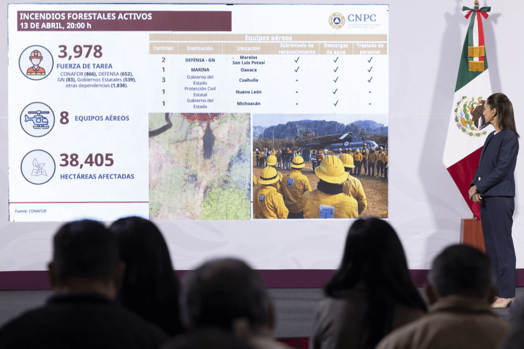 Regeneración, 14 de abril de 2025. Durante la Mañanera de Sheinbaum, se reportaron 114 incendios registrados en México, por Protección Civil, en esta temporada de estío.