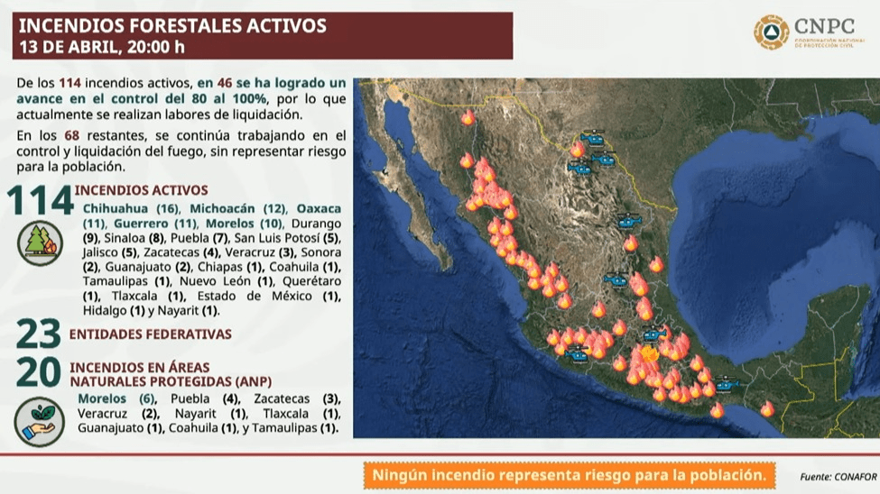 Y es que Laura Velázquez detalló, reportados un total de 114 incendios forestales activos en 23 entidades que sin embargo, por el momento, no representan un riesgo para la población.