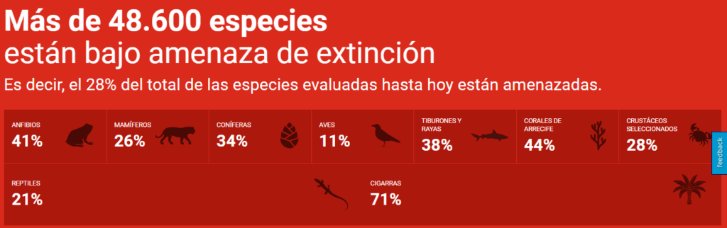 Según la base de datos de la UICN, 172.620 especies han sido evaluadas, de las cuales 48.646 están amenazadas de extinción, el 28% del total.