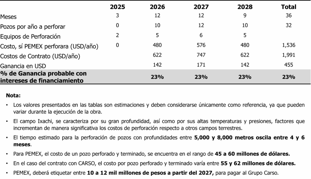 Cabe destacar que el monto máximo de $1,991 millones de dólares incluye el financiamiento provisto por Grupo Carso; este valor se ajustará a la baja si se perforan menos pozos.