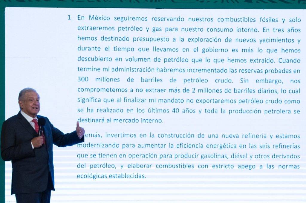 López Obrador se comprometió a extraer combustibles fósiles sólo para consumo interno; así como a incrementar las reservas a 300 millones de barriles de petróleo crudo al concluir el sexenio. También indicó que como máximo se extraerán 2 millones de barriles diarios.