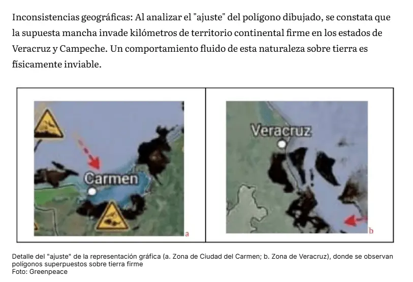 Además se indican inconsistencias geográficas, esto es que al analizar el «ajuste» del polígono dibujado, se constata que la supuesta mancha invade kilómetros de territorio continental firme.