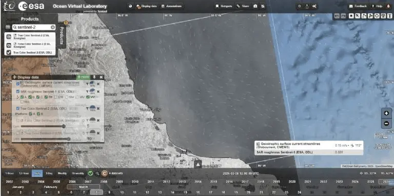 En tanto que en la imagen SAR de Sentinel-1 del 14 de febrero de 2026, se aprecia una mancha oscura más definida en la región de la Sonda de Campeche.