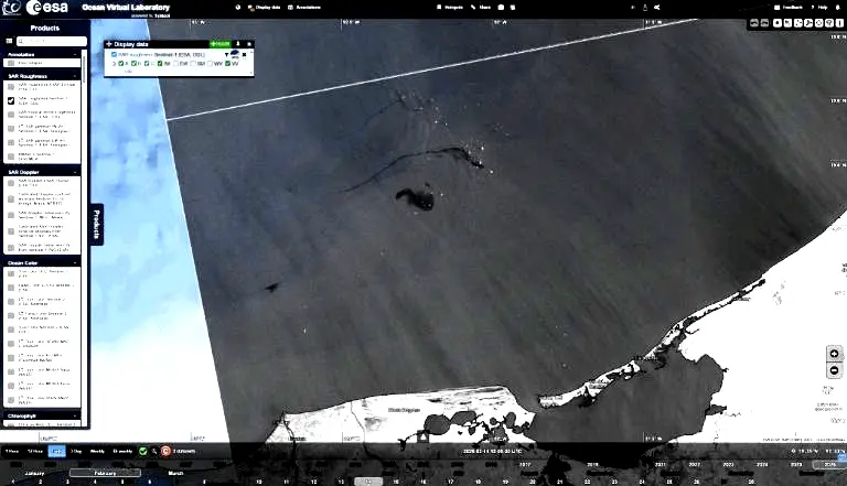 Con relación a la imagen SAR de Sentinel-1 del 17 de febrero de 2026 se indica que en las cercanías de las plataformas de la observación anterior, las manchas oscuras detectadas disminuyen drásticamente su tamaño.