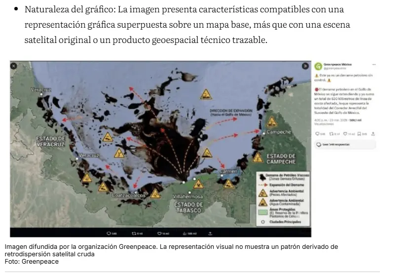 Al tiempo que se indica que «aunque sí detectamos posibles filamentos de hidrocarburos y algunas manchas oscuras, sobre todo cerca de las plataformas petroleras en la Sonda de Campeche, no podemos asegurar que sean derrames sin hacer pruebas directamente en el agua».