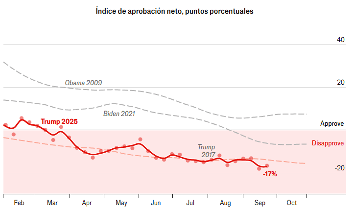 Regeneración, 24 de septiembre 2025– En los nueve meses transcurridos desde que asumió el cargo, Donald Trump ha puesto en marcha una transformación drástica del gobierno estadounidense. No ha sido bien aceptada en su última encuesta de aprobación.