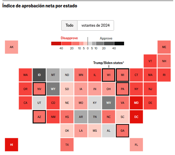 Pero la proyección también muestra cómo el descontento con Trump es generalizado incluso en estados que votaron por él hace apenas unos meses.