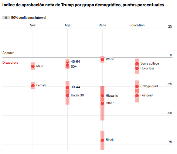 Al igual que otros políticos republicanos antes que él, los votantes blancos y hombres se encuentran entre los más propensos a aprobar la gestión de Trump.