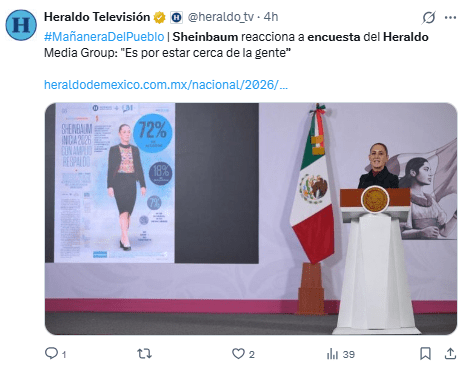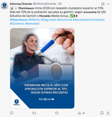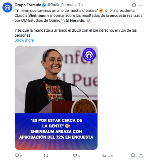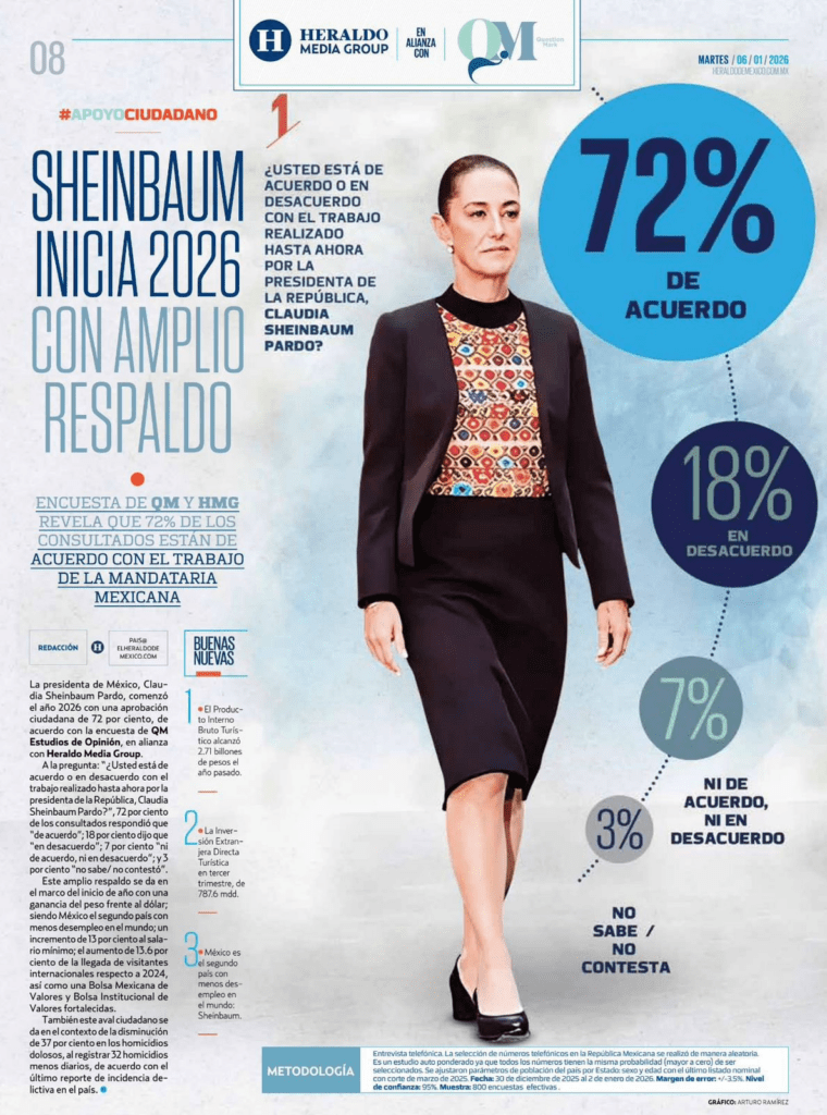 Regeneración, 6 de enero 2026– La presidencia de México de Claudia Sheinbaum, continúa siendo muy avalada por la población, ya que el 72% de los consultados aprueban su actuación como líder, según la encuesta de QM Estudios de Opinión en colaboración con Heraldo Media Group.
