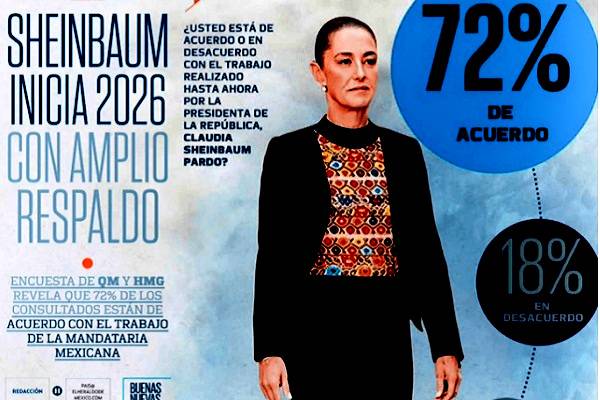 Regeneración, 6 de enero 2026– La presidencia de México de Claudia Sheinbaum, continúa siendo muy avalada por la población, ya que el 72% de los consultados aprueban su actuación como líder, según la encuesta de QM Estudios de Opinión en colaboración con Heraldo Media Group.